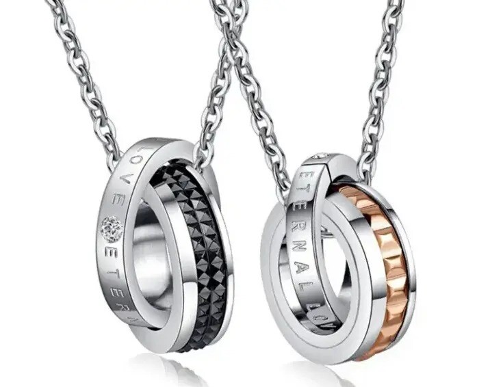 Кулони для закоханих Кільця Спінер виготовлені у вигляді переплетення двох кілець золотого та сріблястого кольору для жінки та чорного та сріблястого для чоловіка. На срібних кільцях кулонів нанесено гравірування: "Etelnal Love", що в перекладі з англійської: "Вічна любов". Матеріал кулонів нержавіюча (медична) сталь 316 L. Фішка даних кулонів кілець у прокручуванні чорної та золотистої смужки на кільцях за аналогом спинера