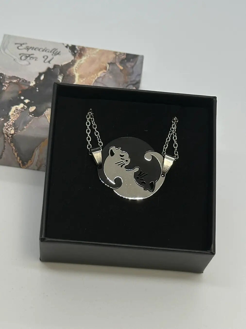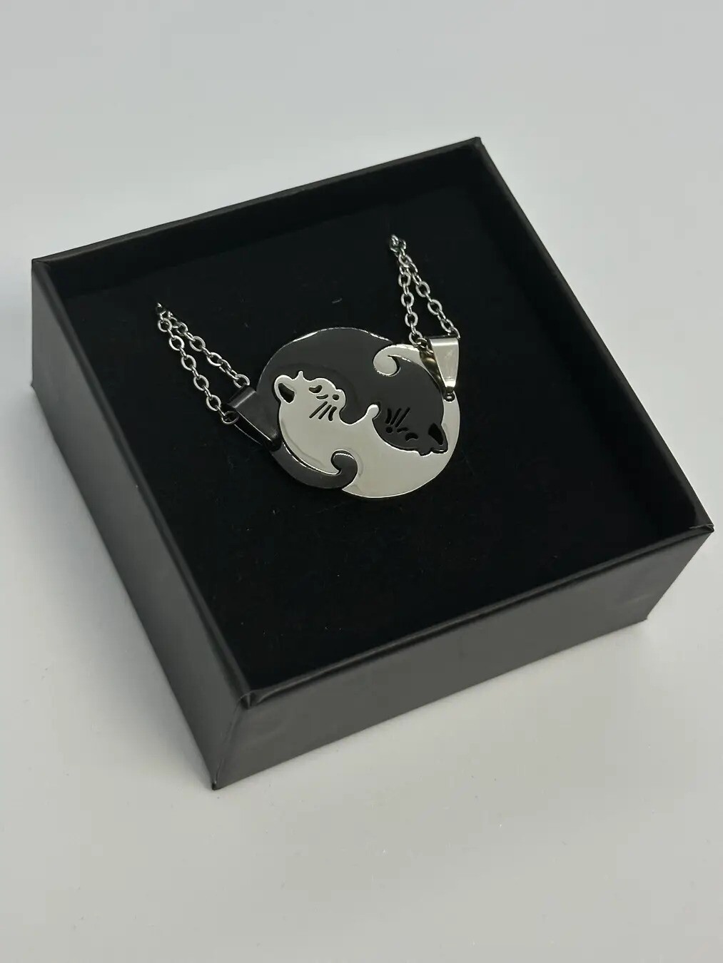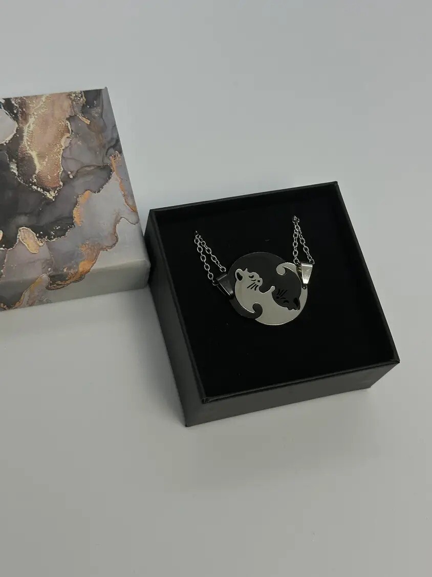 Чудовий подарунок для подруги, сестри, пари закоханих — кулони Кішки на ланцюжках. Чорний і сріблястий кулони — дві кішки. У наборі два кулони кожен на ланцюжку.